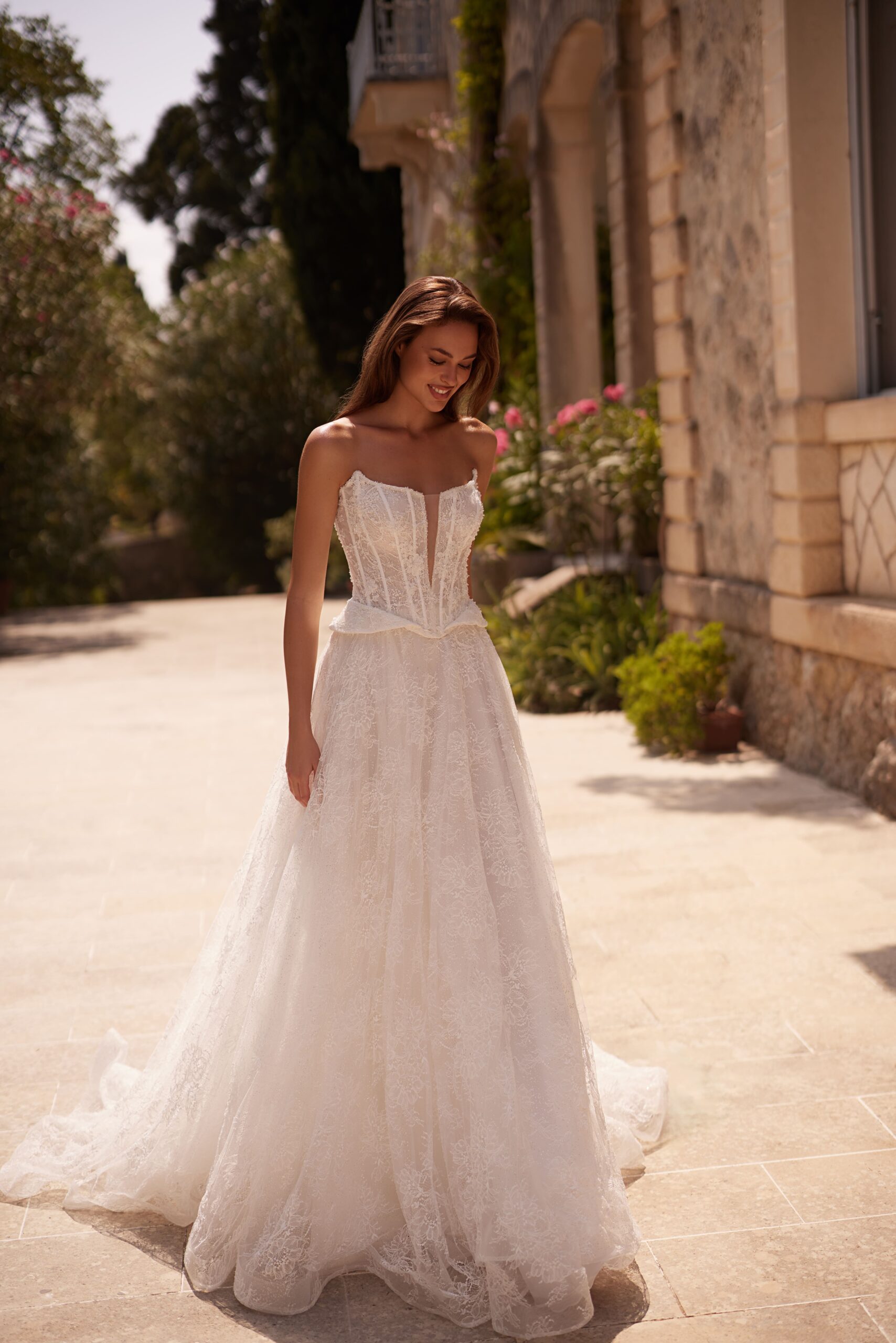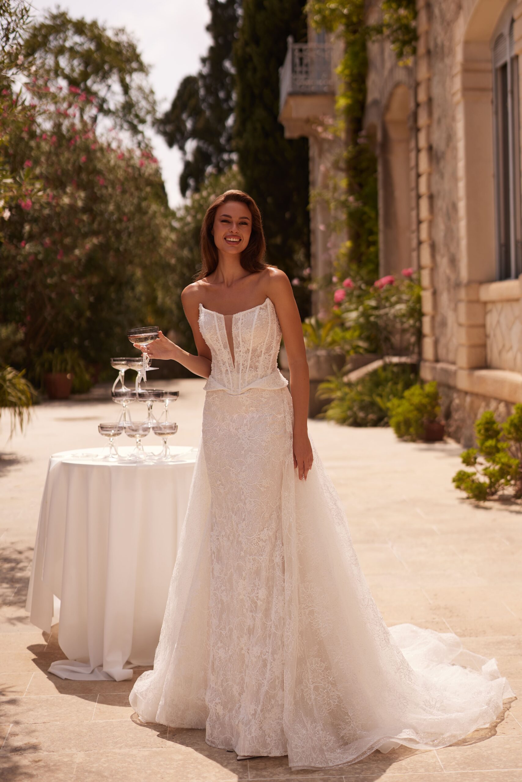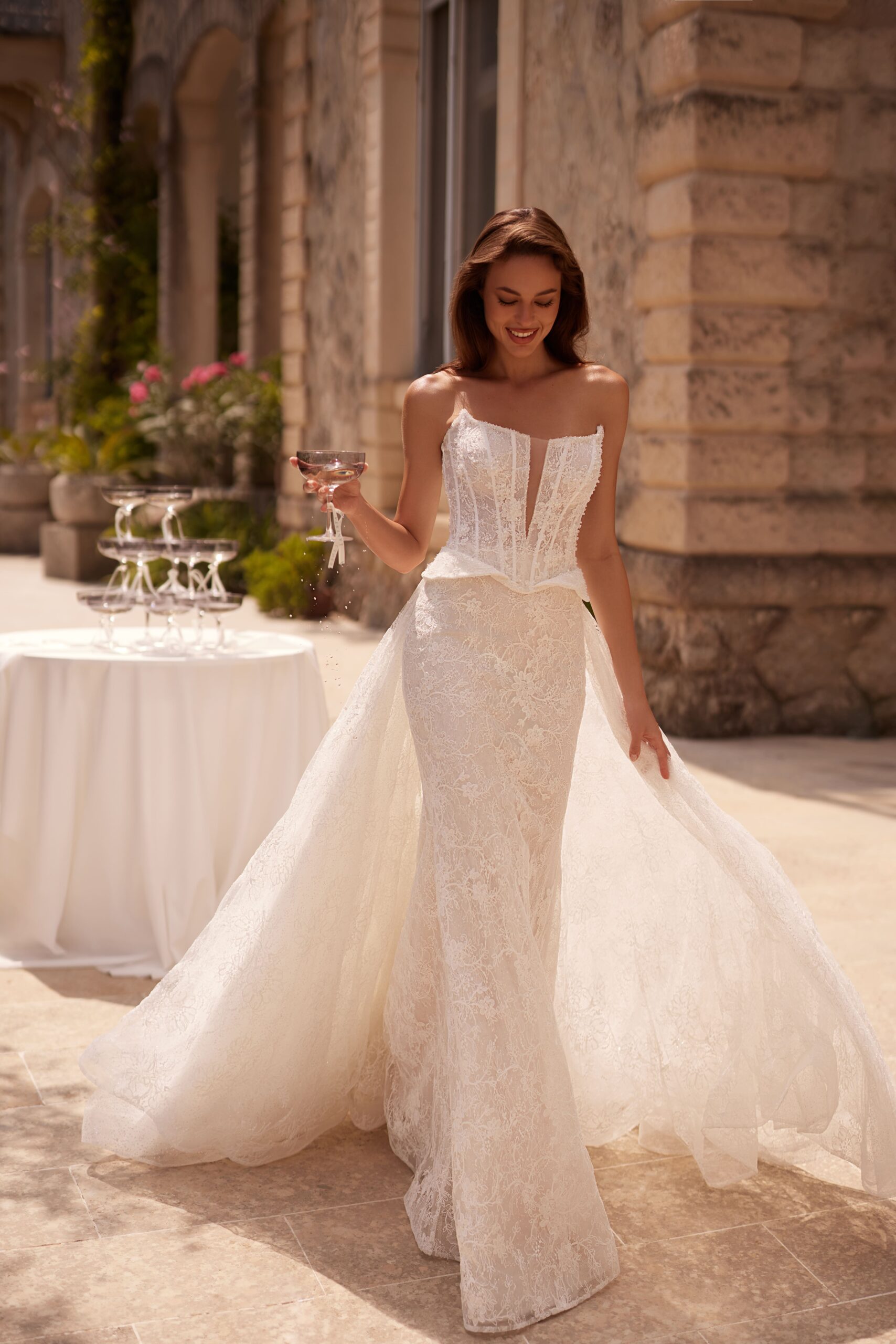 Korsetinė liemenė suteikia idealią formą, pabrėžia liemenį ir užtikrina nepriekaištingą prigludimą. Nėriniuotas vestuvinės suknelės audinys kuria lengvumo ir romantikos įspūdį, o preciziškai apgalvotos detalės suteikia prabangos pojūtį.
