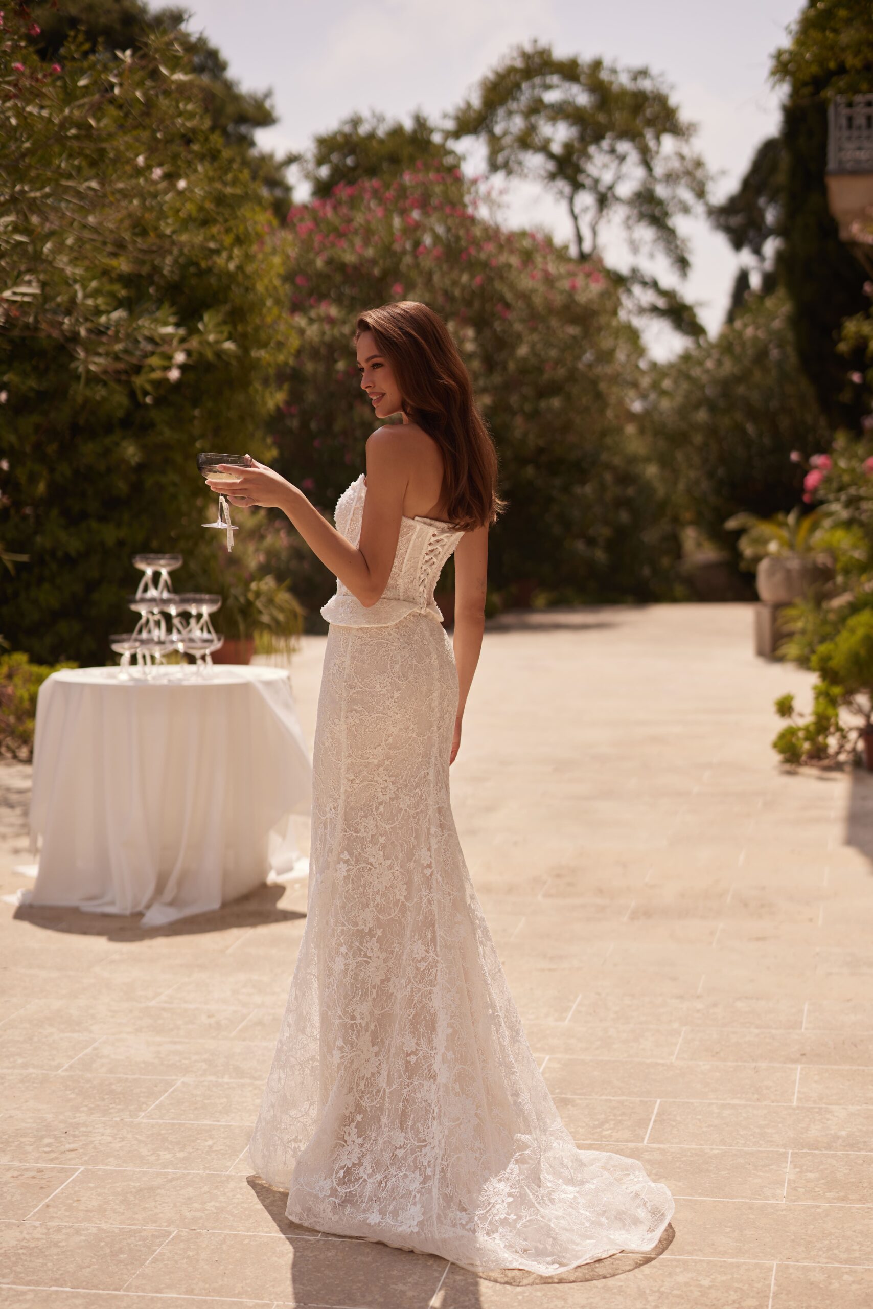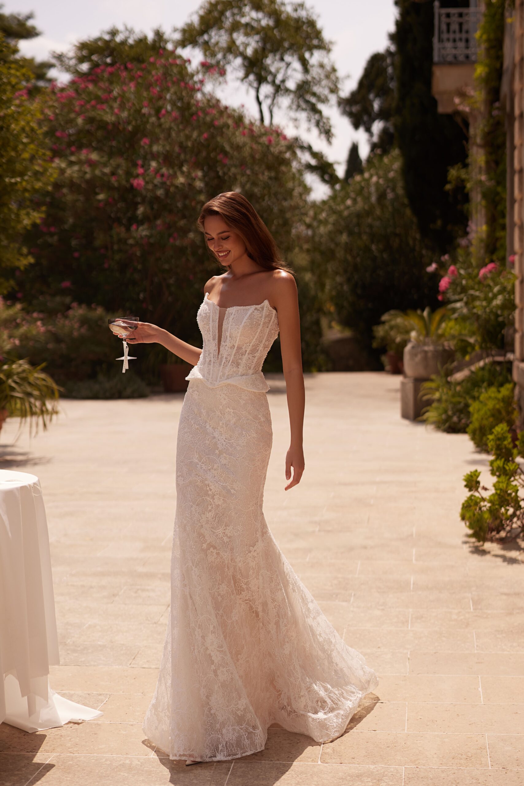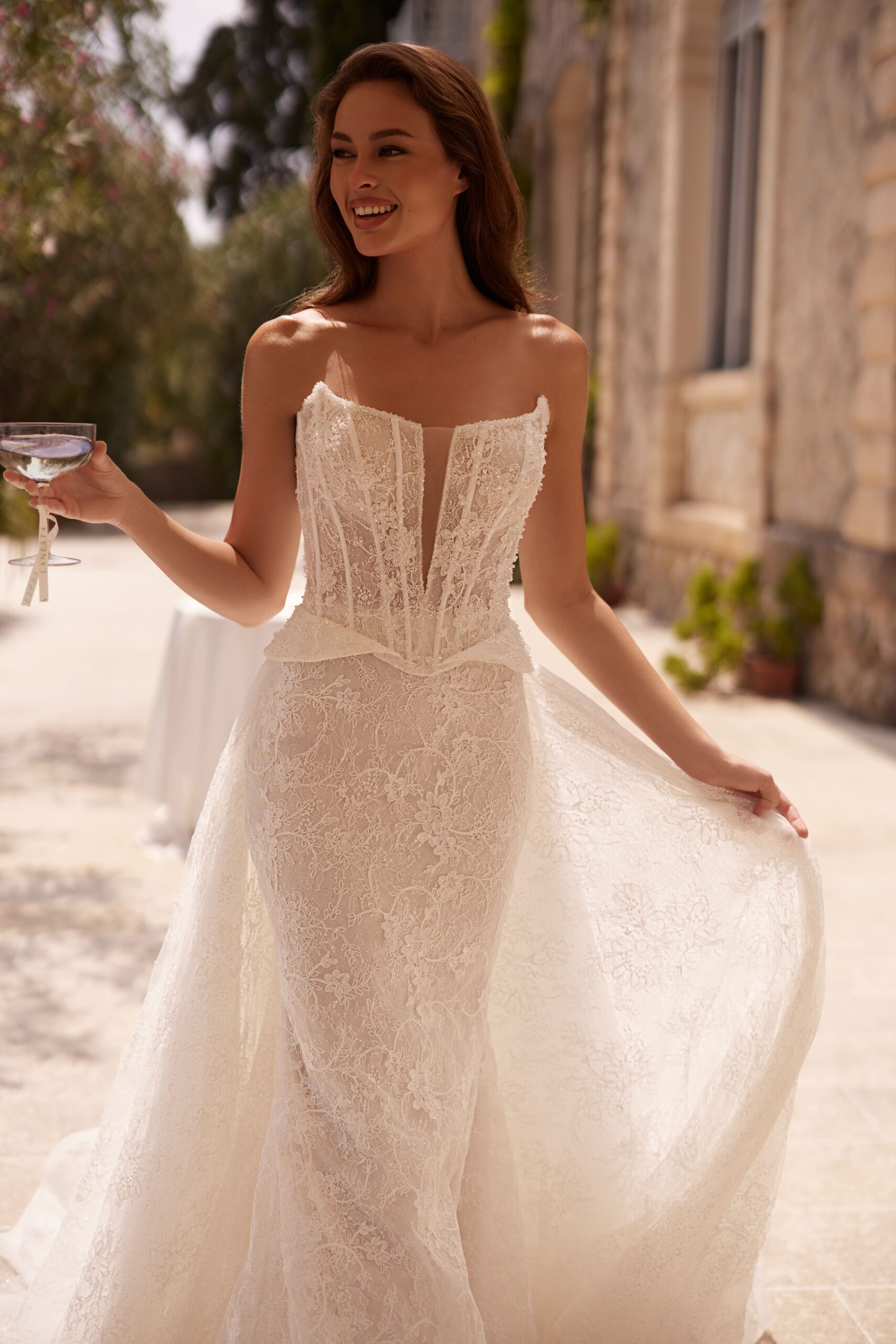 Korsetinė liemenė suteikia idealią formą, pabrėžia liemenį ir užtikrina nepriekaištingą prigludimą. Nėriniuotas vestuvinės suknelės audinys kuria lengvumo ir romantikos įspūdį, o preciziškai apgalvotos detalės suteikia prabangos pojūtį.